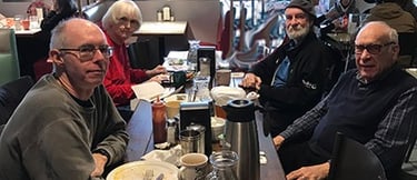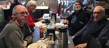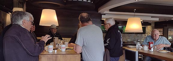 At one of our weekly social meetings at Denny's, Ronald Trainor (the Bat Man, second from right ), dropped by to teach us all about the need for bat houses. Frankly, I didn't know there were so many homeless bats, but you learn something everyday.