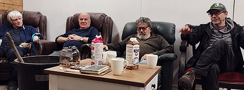 In our 'woodstove-warmed' lounge, Bill (R) proposes we buy more pencils. The rest, (Alex, John, Bruce) are not listening as we just pigged out on Bruce's upsidedown apple pie & coffee.