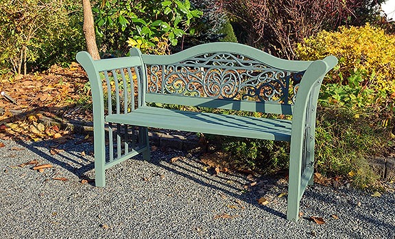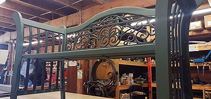Another beautiful bench comes together with a hand-painted rose. Wood and iron together always work well.
