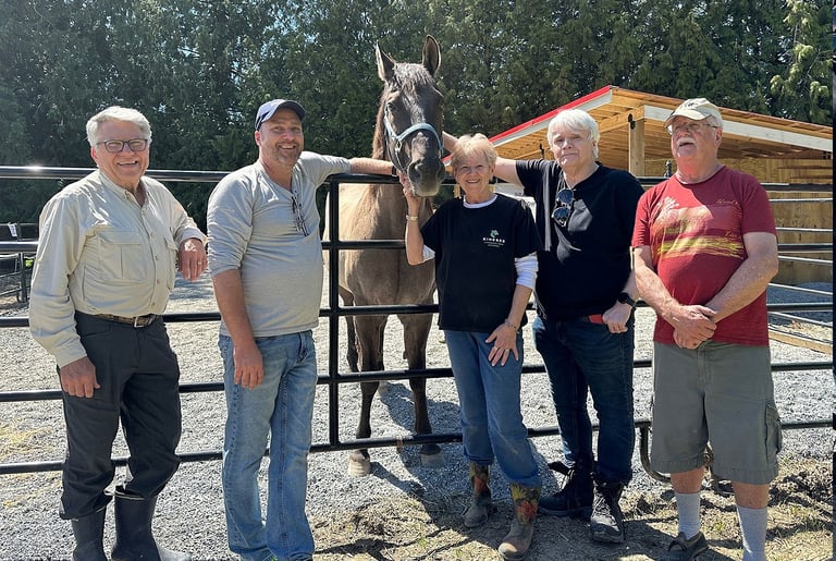 On May 10th., 2024, Three Men's Shed Langley members dropped by Kindred Farms to see if they could help out with various needed repairs and constructs. Here we see (L-R) Maurice, Greg, Badger, Marilyn, Alex, George. Marilyn, George & Badger are from Kindred Farms. Considering the fine job Kindred Farms do of helping out distressed farm animals and distressed humans, we will gladly try to assist in repairs.