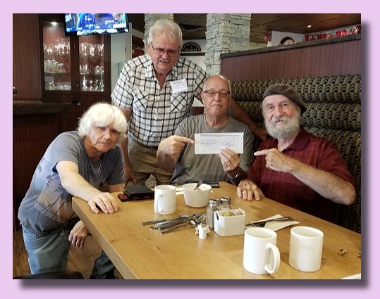 Happily receiving a $500.00 cheque from 'Langley Seniors in Action' members Paul Crump (right centre) and Ron Bergen (left centre), are President Ray Girard (right side) and Vice-president Alex Paylor (left side)..... of Men's Shed Langley.