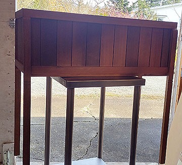 Ray finally finished a 3' x 1' raised planter for small patios. Cedar with oak legs. Moisture sealed with a black cloth liner.